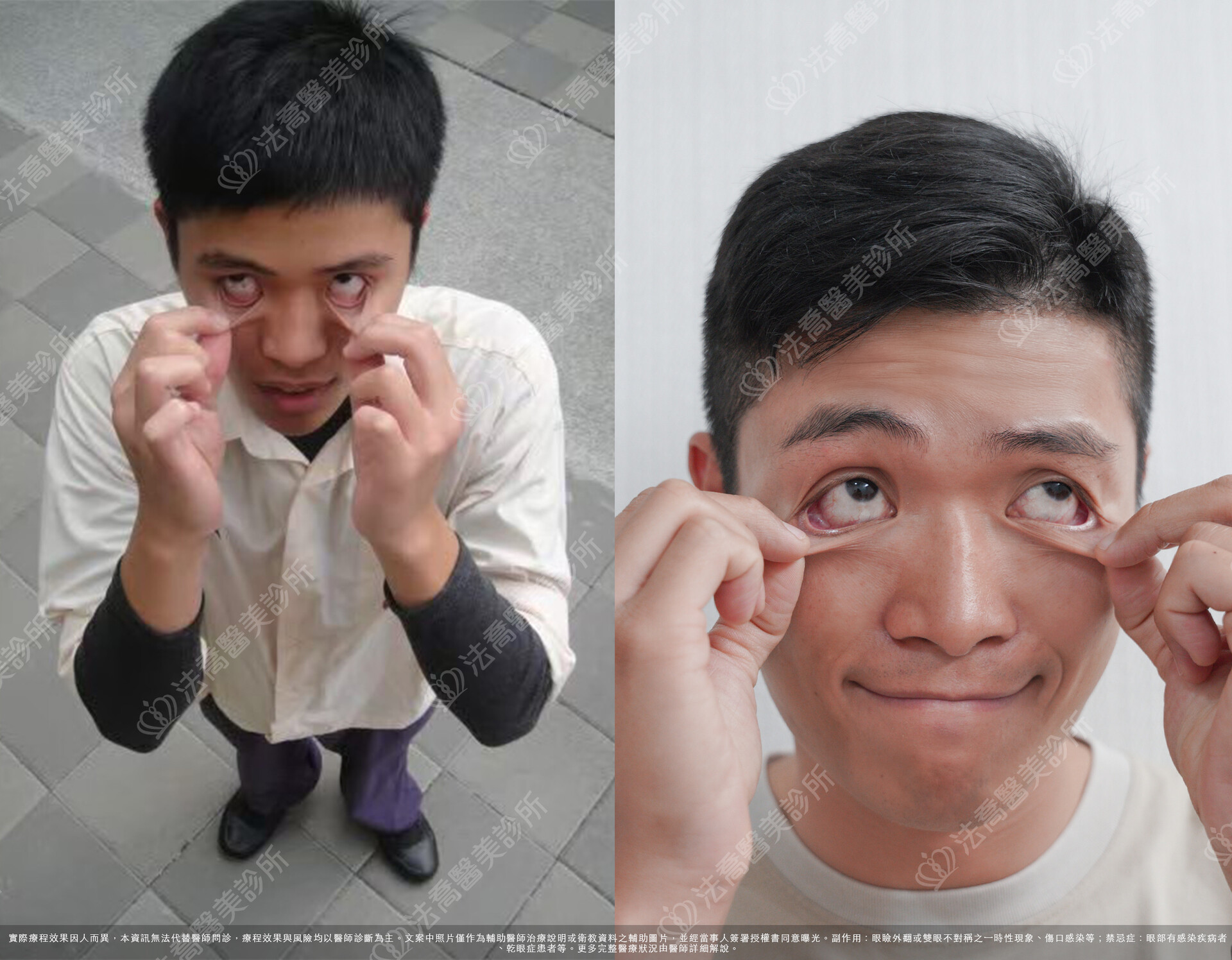 - 術後眼睛不自然 、 兩眼不對稱:術後可能因腫脹或疤痕問題,造成兩眼暫時性的不自然或不對稱,建議等 3至 6 個月,待疤痕軟化或完全消腫再做最後評估,通常雙眼不對稱需要進行二次修復的機率為 5%,人的器官多有天生性生理不對稱,加上大多是疤痕收縮造成。此為不可控制之因素,病患並無法要求雙眼 一定必須 100 %完全對稱 。