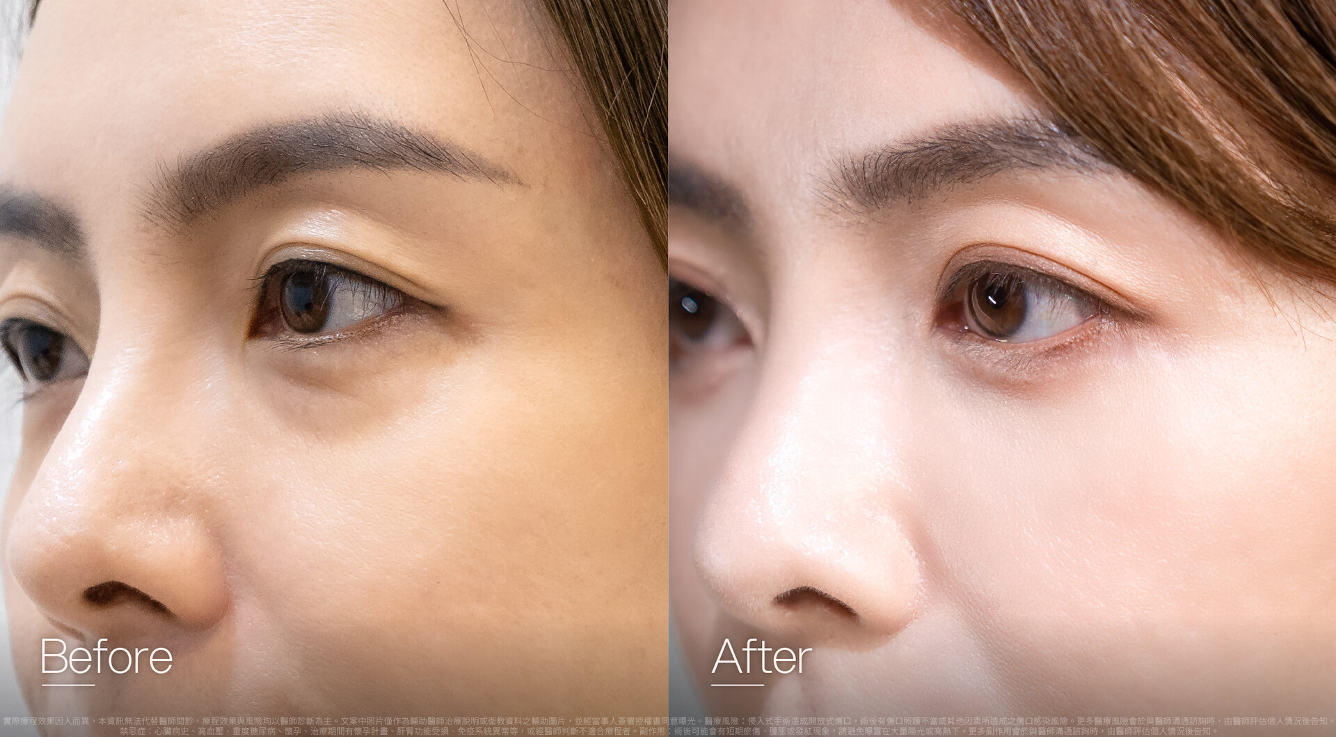 - 眼球周圍的整形手術,少數可能會影響眼球深部血管或神經,導致眼球及眼皮運動失調、視力不良、模糊或失明。返家後若有出現視力模糊問題,請立即返院回診。