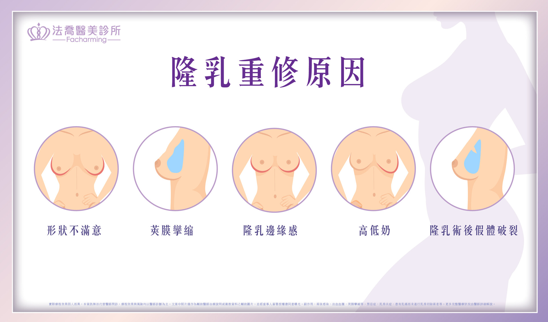 需要二次隆乳重修常見的原因有莢膜攣縮、假體破裂、假體位置過高或過低、不滿意尺寸、觸感、形狀等等,所以二次隆乳前術前溝通非常重要,需要了解客人想要的胸型、胸部大小,也須評估身高比例、高低肩、脊椎側彎與否、副乳、腰寬、骨盆寬。因先天條件的不對稱可能導致隆乳術後兩側胸型無法完全對稱的可能,只有術前詳細告知,雙方得到共識,才能把彼此之間的認知差異降到最低。