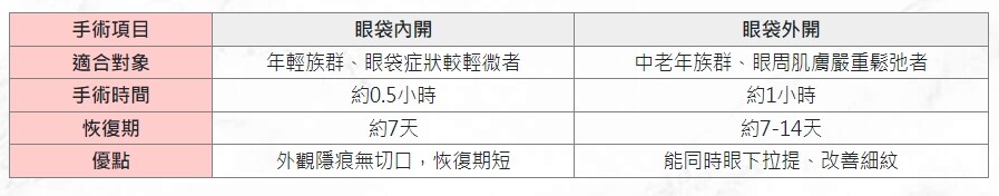 眼袋皮膚鬆弛者,可經由眼袋外開手術,將眼袋脂肪往下移位使淚溝填平,並將鬆弛的下眼皮拉緊,剪除多餘贅皮,讓整個眼睛看起來更炯炯有神,擺脫老態。