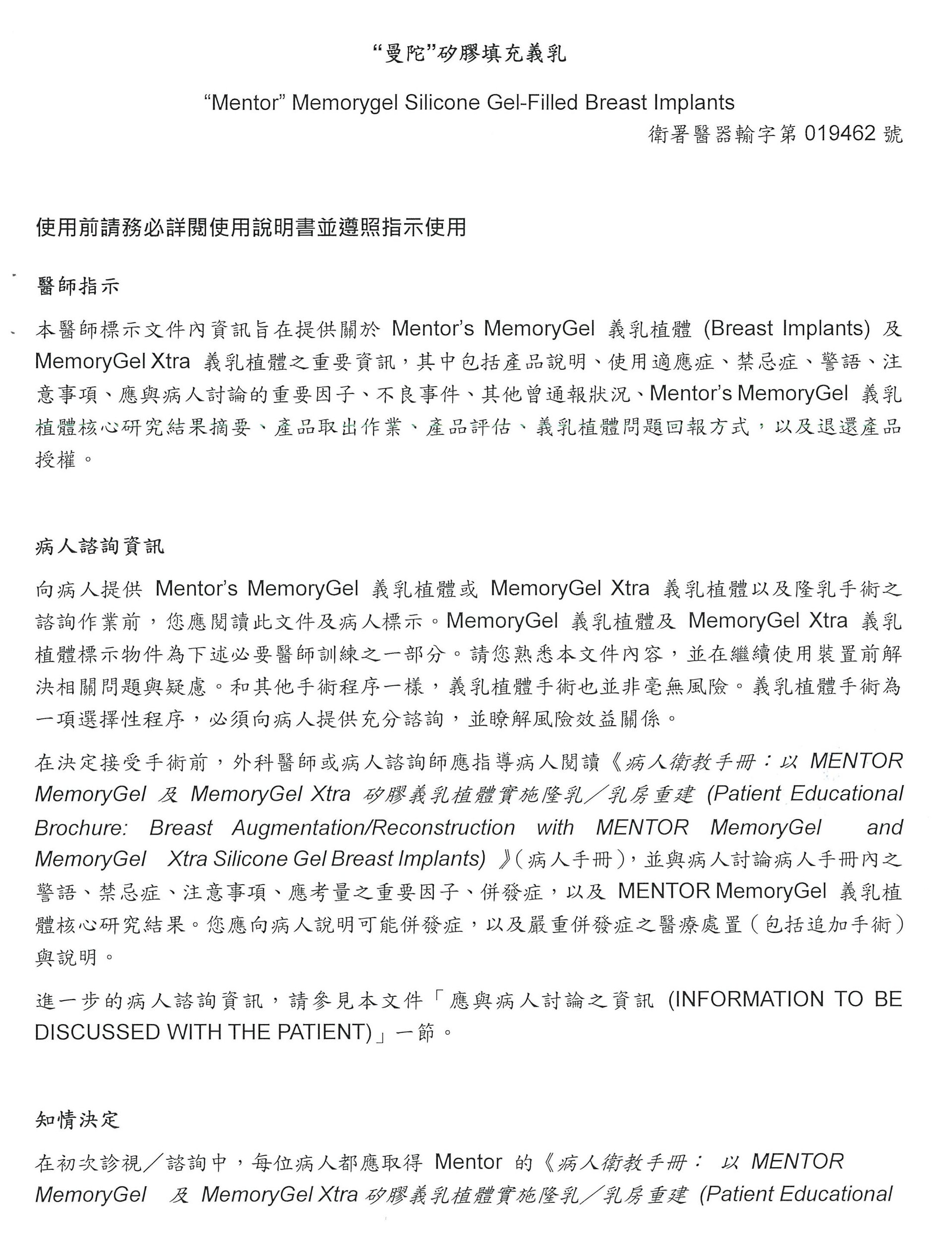 請告知病人:義乳植體並非終生使用的裝置,病人可能會在一生中將義乳植體取出更換或不更換新植體。請告知病人,取出義乳植體後,乳房可能會出現不可逆的變化。