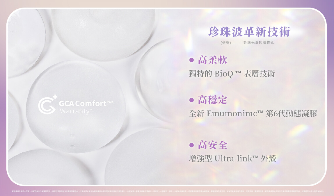 從GCA® 提供的資訊中可以了解,珍珠波 PERLE™/盈波IMPLEO™ 擁有多項品質保證,這也是GCA®憑藉 40 年的經驗與聲譽所精心打造的產品。