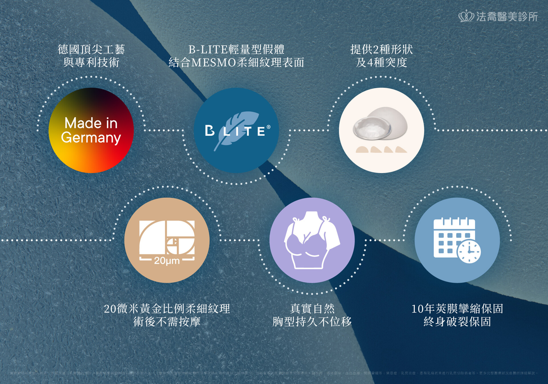 | 保固 | 10年:莢膜攣縮 終身:破裂 | 12年 | 10年 | 終生保固 | 終生保固 | 10年 |