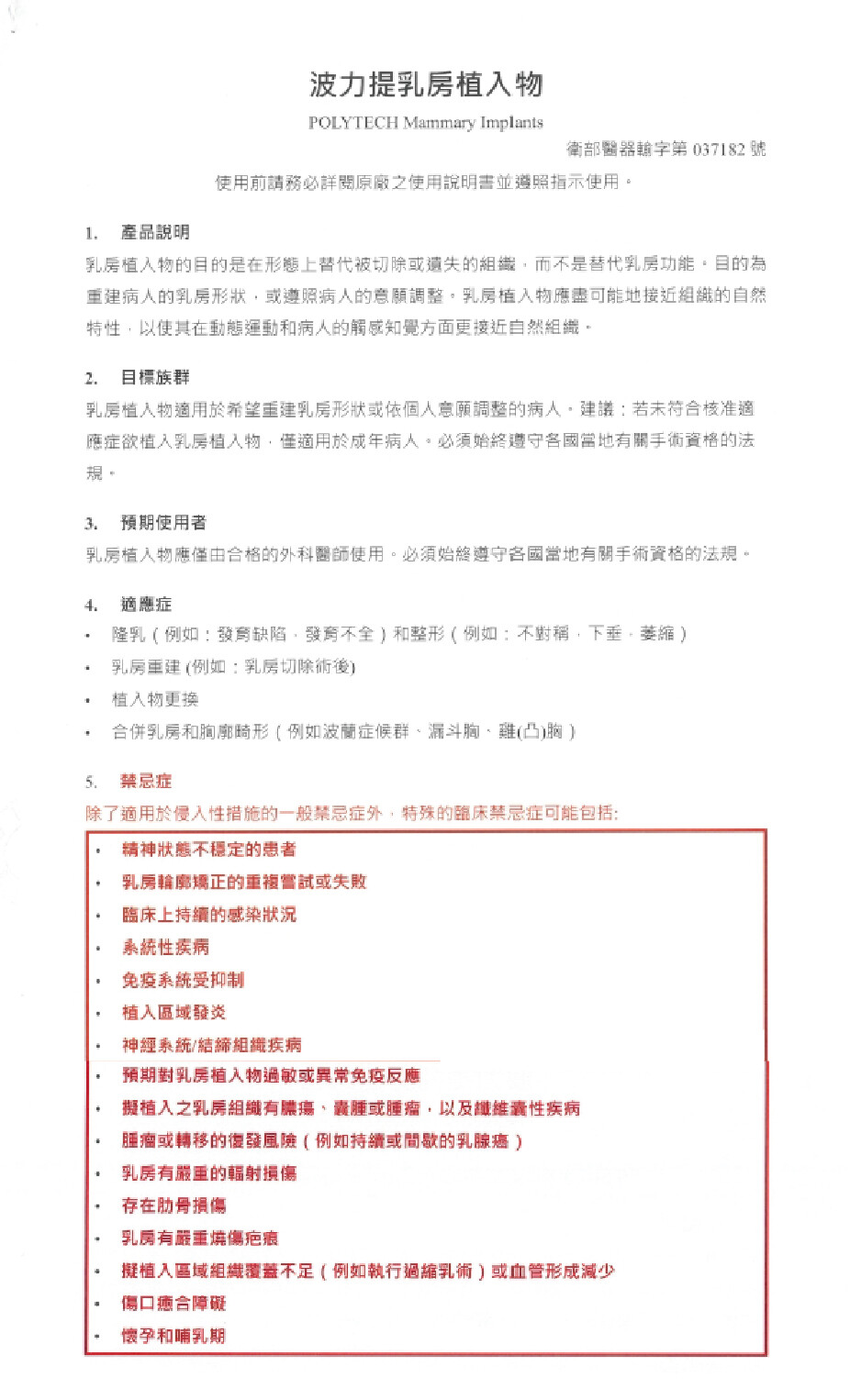 本產品採用雙重無菌包裝。在手術室中,只要無菌內包裝未損壞或未打開,就能確保產品的無菌性。在植入手術期間應備有備用植入物。當無菌包裝受損時,無法保證其無菌性。請勿使用損壞的乳房植入物。如有疑問 ,請聯繫 POLYTECH Health & Aesthetics 或各國當地經銷醫療器材商。