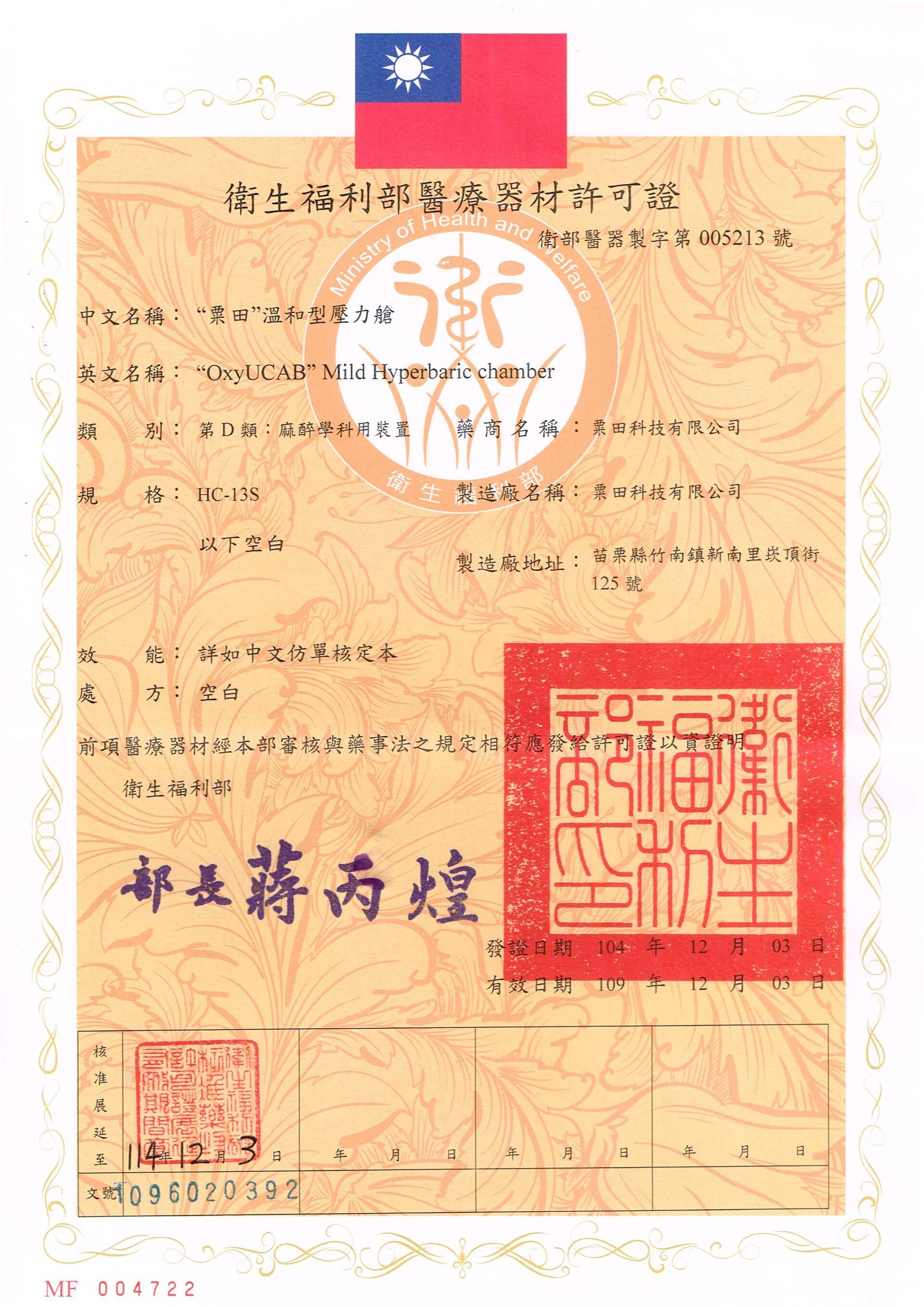 尊爵溫和型高壓氧艙尊爵溫和型高壓氧艙(俗稱)“粟田”溫和型壓力艙“OxyUCAB” Mild Hyperbaric chamber “粟田”溫和型壓力艙 衛部醫器製字第005213號 台灣衛生福利部醫療器材許可證 TOP