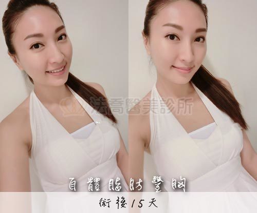 第13天:瘀青都退的差不多了,今天第一天開始接活動出門工作,由於三個月內不能穿有鋼圈胸罩壓迫胸部,所以我穿有附胸墊的平口小可愛搭上洋裝加高跟鞋,不過大腿內側因為抽脂的關係,感覺還有點緊繃,雖然還無法走秀,但接一般活動工作都是沒有問題的。