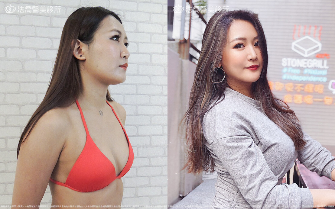本案例主人翁身材屬於上胸無肉又下垂外擴,加上主人翁職業是舞者,希望穿兩截式服裝時,可以有馬甲線與性感腰窩。經評估討論,採用「果凍矽膠隆乳(俗稱)曼陀矽膠填充義乳合併自體脂肪豐胸,並使用威塑超音波抽脂(俗稱)」指的是採用原有的圓盤式果凍矽膠隆乳(俗稱),為了使邊緣感較不明顯,使用自體脂肪豐胸,也就是俗稱的包心粉圓做法,讓整體胸型看起來飽滿自然。本案例自體脂肪採用威塑超音波(俗稱)抽脂,目的是讓高存活率的脂肪可回填利用,達到深抽脂、淺精雕,打造客製化名模級的完美曲線!