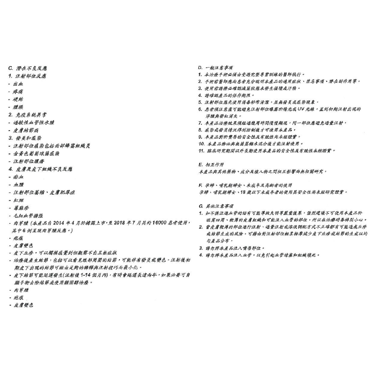 - 可能會有瘀血、血腫、注射部位萎縮、皮膚肥厚症、紅斑、蕁麻疹、毛細血管擴張、肉芽腫、疤痕、皮膚變色、皮下丘疹、皮下結節等皮膚及皮下組織之不良反應。