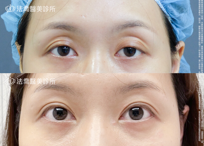 - 術後眼睛不自然 、 兩眼不對稱:術後可能因腫脹或疤痕問題,造成兩眼暫時性的不自然或不對稱,建議等 3至 6 個月,待疤痕軟化或完全消腫再做最後評估,通常雙眼不對稱需要進行二次修復的機率為 5%,人的器官多有天生性生理不對稱,加上大多是疤痕收縮造成。此為不可控制之因素,病患並無法要求雙眼 一定必須 100 %完全對稱 。