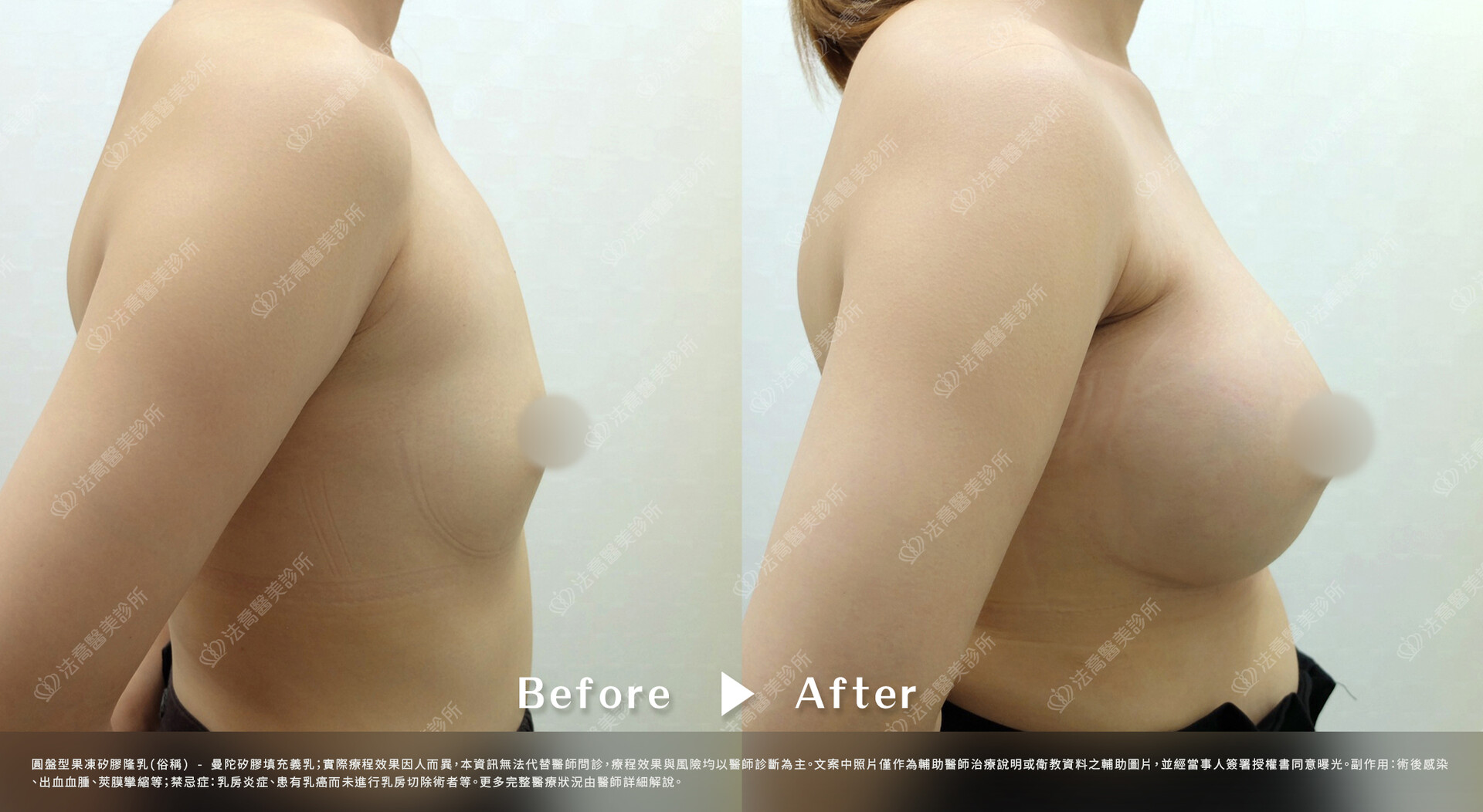 ▲圓盤果凍矽膠隆乳 / 術前與術後1個月(文案中照片僅作為輔助醫師治療說明或衛教資料之輔助圖片,並經當事人簽署授權書同意曝光。)