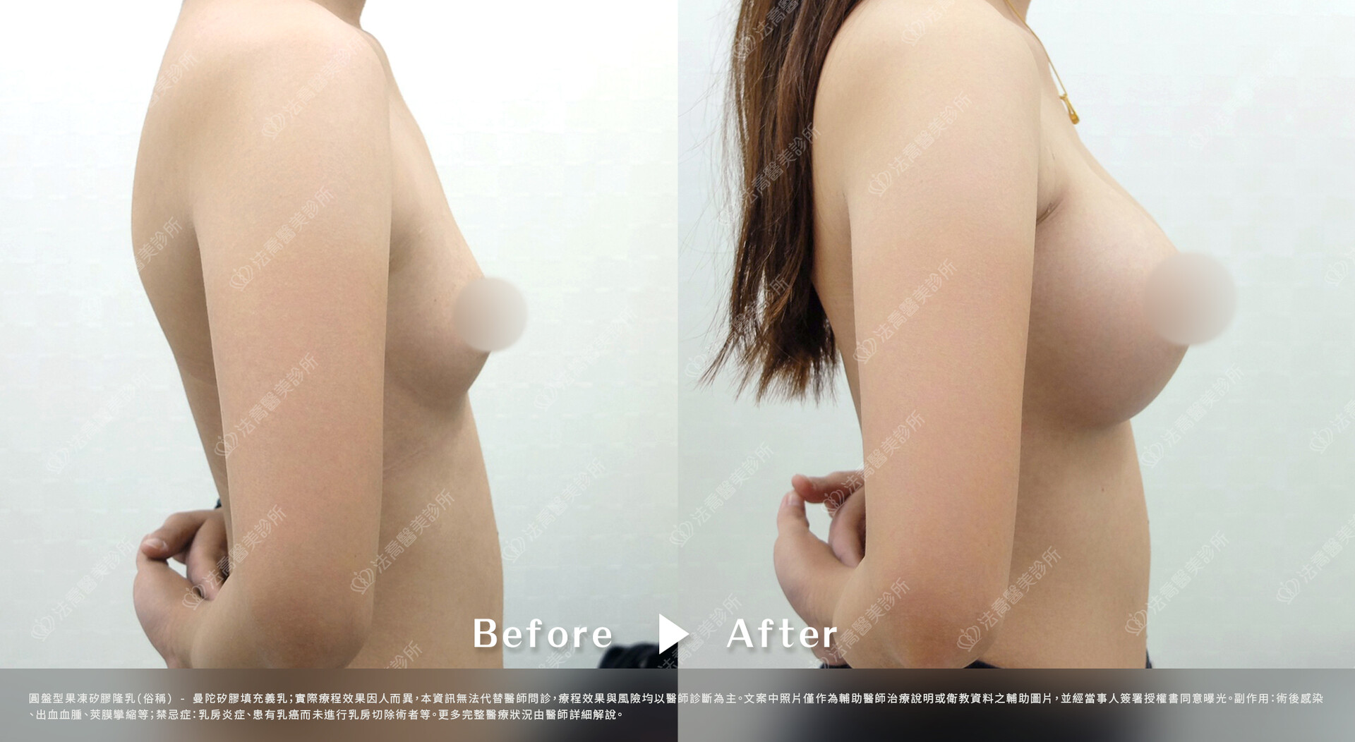 ▲圓盤果凍矽膠隆乳 / 術前與術後1個月(文案中照片僅作為輔助醫師治療說明或衛教資料之輔助圖片,並經當事人簽署授權書同意曝光。)