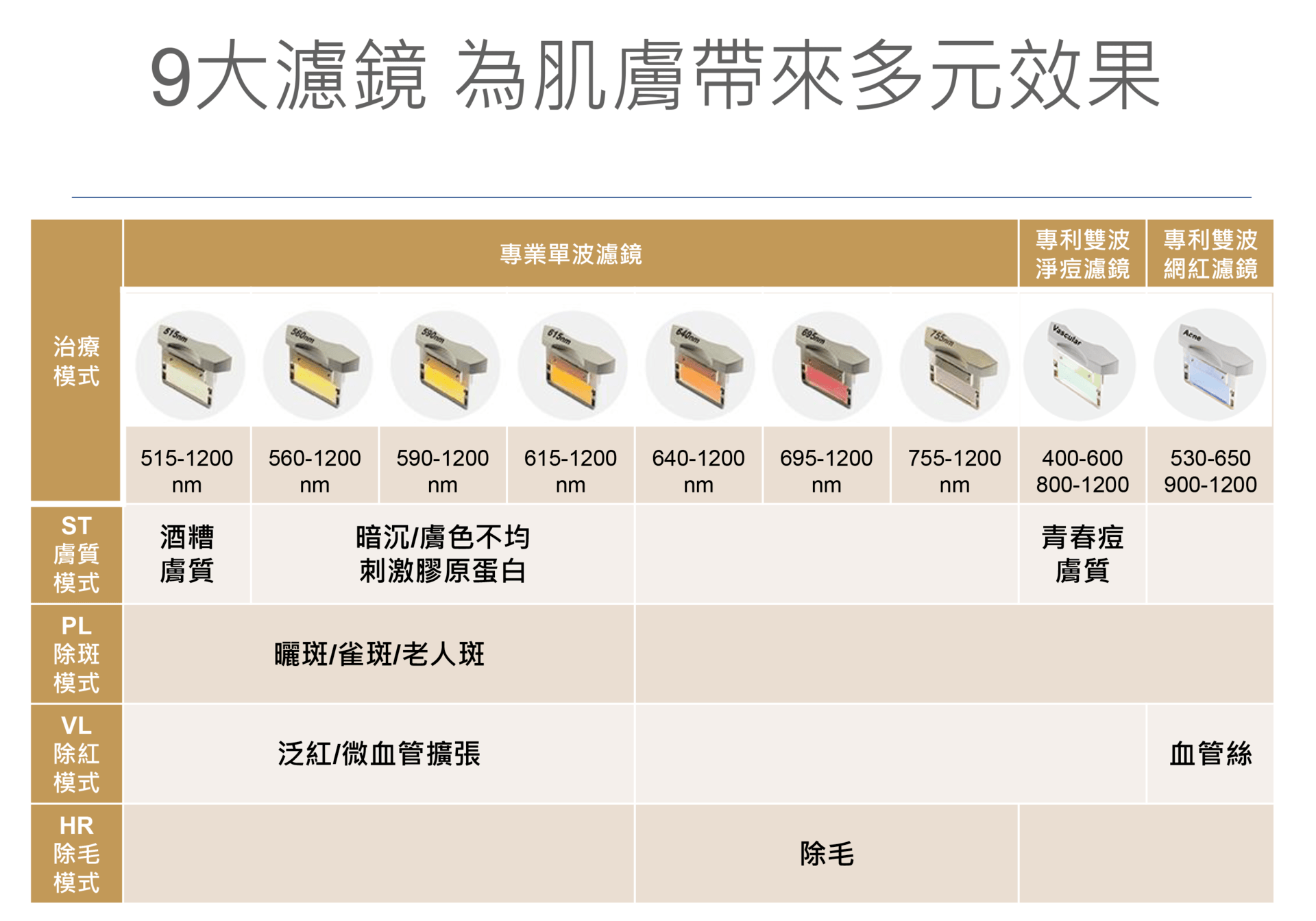 多種濾片,針對不同膚色、不同適應症為肌膚帶來多元效果,OPT彩衝光可改善多種肌膚問題: