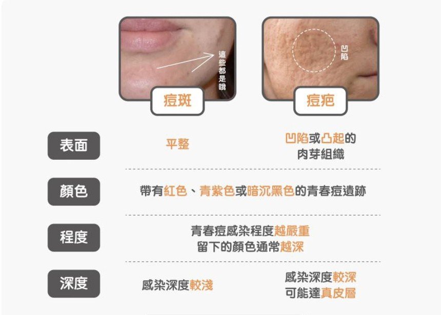 痘疤:除了上述的顏色變化之外,還同時出現「凹陷」或者「凸起」的肉芽組織。