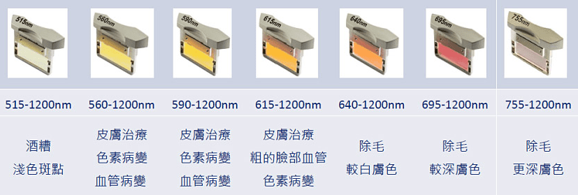 波長差異 | ✔單波波段可進一步細分為七種光束:515nm / 560nm / 590nm / 615nm / 640nm / 695nm / 755nm 七種波長濾光鏡,屬於窄波光,治療精準效果佳。 ✔雙波淨痘濾鏡(400-600 & 800-1200nm) ✔雙波血管濾鏡(530-650 & 900-1200nm) 勝! | 寬波光波長550~1200nm |