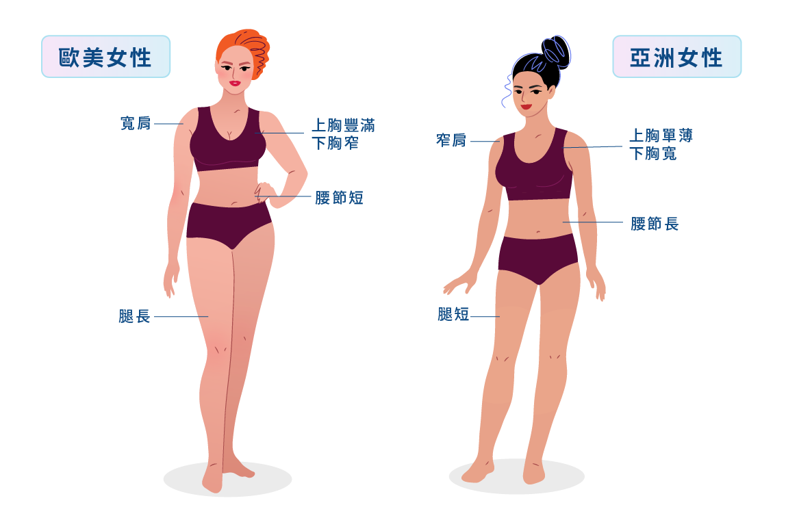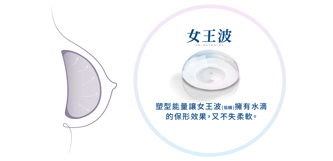 與歐美女性相比,亞洲女性的肩膀普遍較窄,腰部比例也較長,加上亞洲人胸部腺體組織較多,脂肪較少,因此胸型較沒有歐美女性的豐滿。但現今亞洲女性對於隆乳的美學,已發展出自己審美觀,不再一昧追求西方的身材體態,尤其對於下胸寬、上胸肉少的台灣女性來說,隆乳不再是越大越好,而是選擇適合自身身形比例的自然豐滿,因此女王波(俗稱)為亞洲女性身形設計誕生!