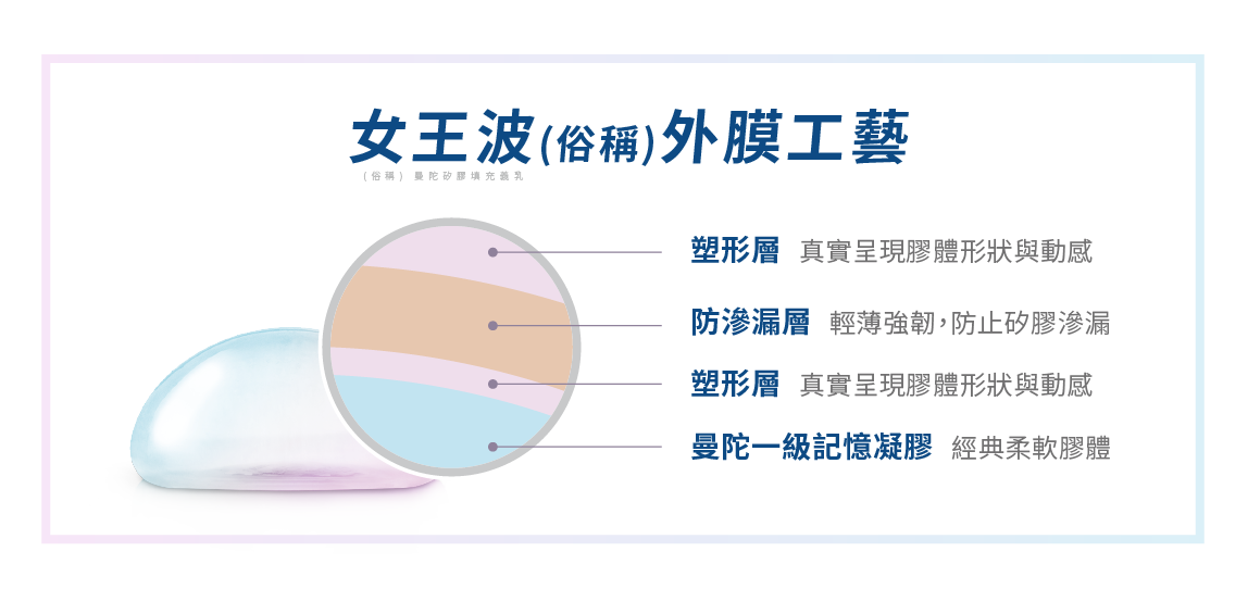 以前有些隆乳手術客為了豐滿的胸部外型,選擇犧牲柔軟與自然晃動感,但女王波(俗稱)具有特殊的設計,與其它品牌義乳相較之下,外膜厚度減少35%,柔韌度增加30%,不僅保有光滑面隆乳的柔軟特性,同時也有不容易破裂的安全保障。