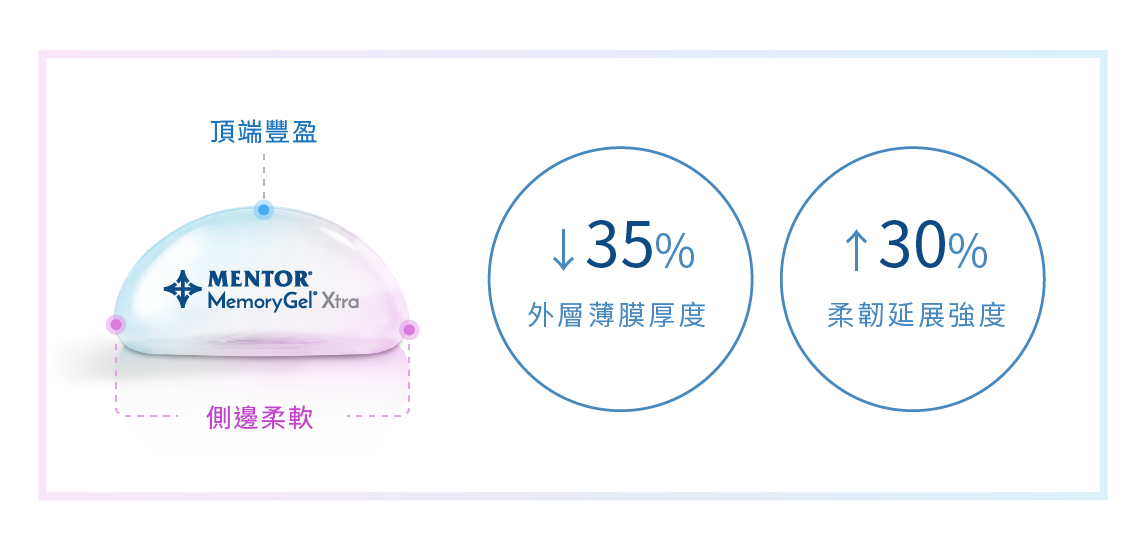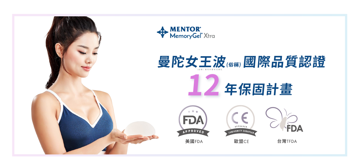 Mentor MemoryGel® Xtra曼陀女王波(俗稱),除了提升傳統曼陀光滑面隆乳(俗稱)的高度,更增加當中凝膠的穩定性與自然度,曼陀也是目前市面上同時擁有美國FDA、歐盟CE與臺灣TFDA三證核可的乳房假體品牌,讓您變美麗的同時也更安心。