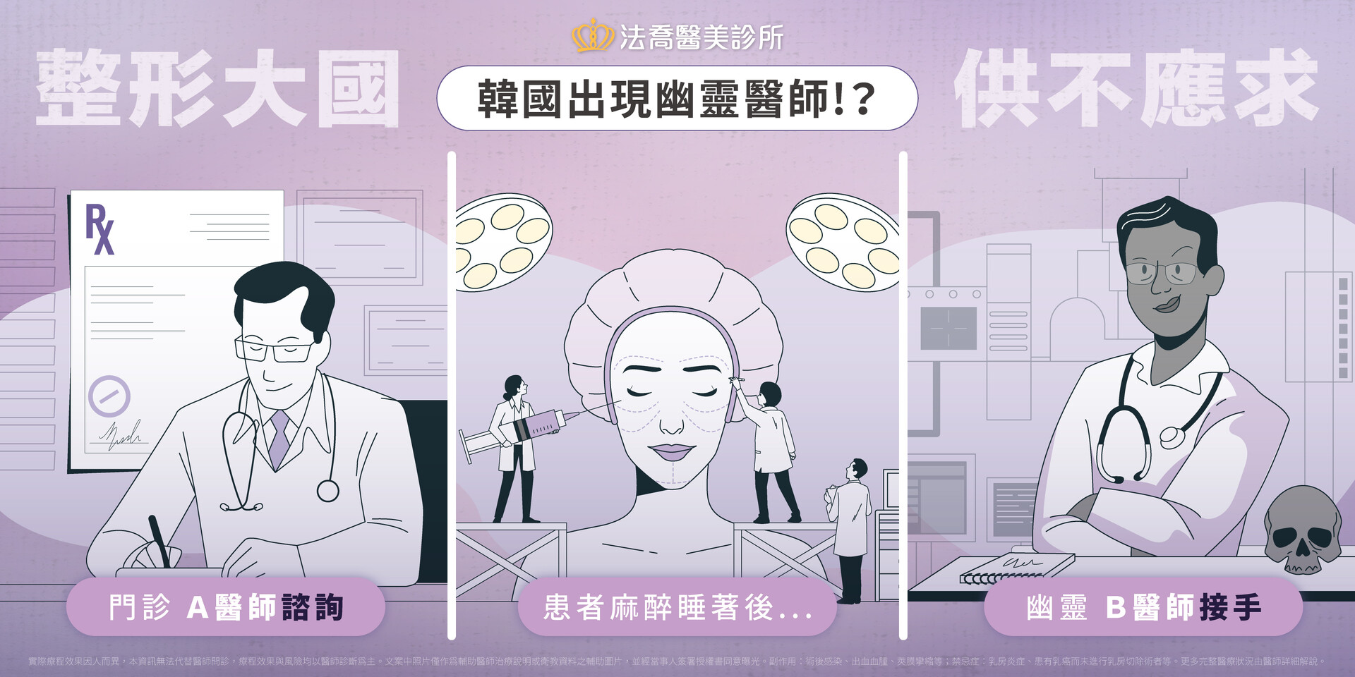 其實幽靈醫師在韓國早已不是罕見的情形,而是整形外科「公開」的秘密😲 也就是指診所在患者手術時,全身麻醉、沒有意識的情況下 擅自以 "非主治醫師" 的「幽靈醫師」代為執刀,而主治醫師則是在多場手術、甚至宣傳活動中奔波,為診所謀取更大的利益。