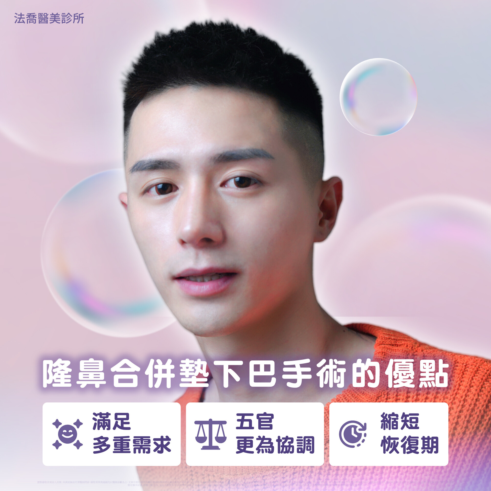 隨著社會對於外表的重視不斷提升,亞洲男性的整形手術需求越來越普遍,以法喬醫美診所的手術門診當中,自體肋骨隆鼻及人工骨墊下巴手術成為不少男性患者的熱門選擇。若是將這兩項手術結合同步進行,不僅能夠達到更佳的面部美學效果,還可以提升手術的安全性和效率。