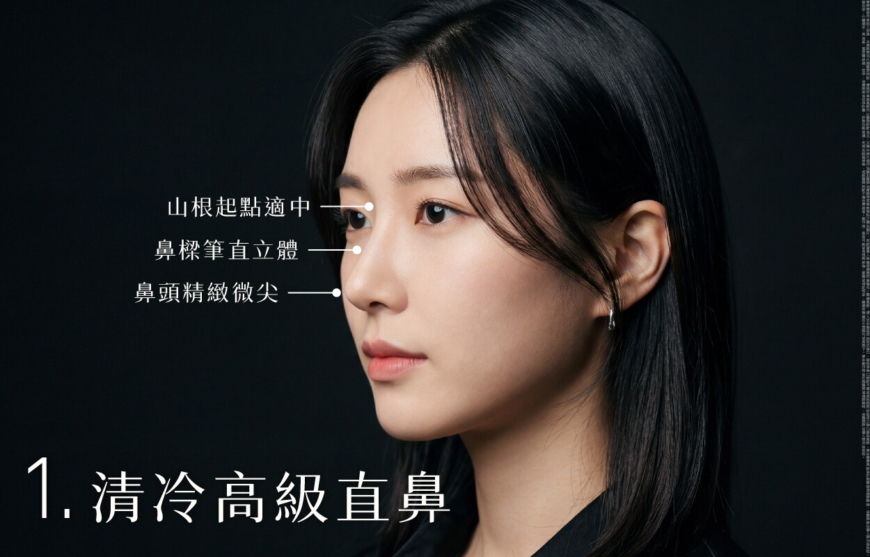 這款鼻型的特徵是「線條極度乾淨俐落」。從山根到鼻尖呈現一條筆直、沒有多餘起伏的優雅直線。山根起點適中,不會過度突兀,但鼻樑的骨骼感與立體度非常明確,鼻頭精緻微尖,不拖泥帶水。自帶一種不費力的高級感、知性與專業度,給人一種冷靜、獨立的「高智感」美女氛圍。
