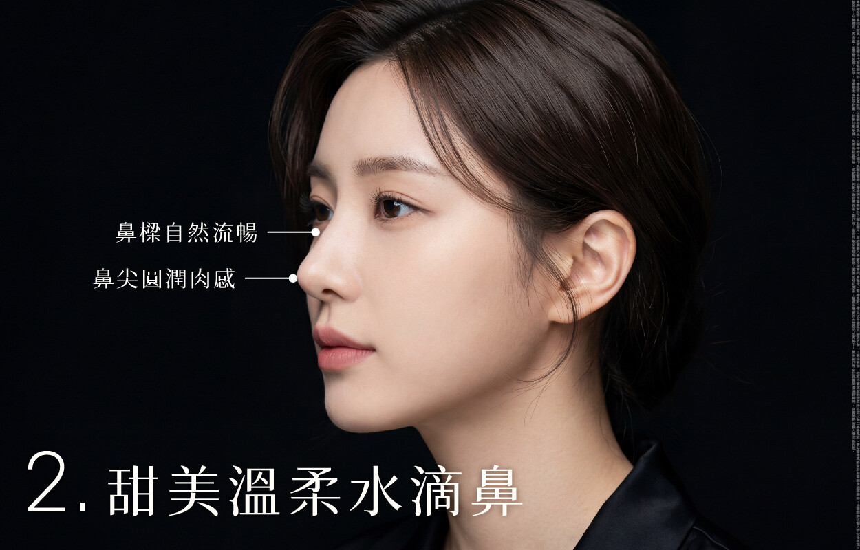 水滴鼻的美學核心在於「鼻頭的精細微調」。鼻樑高度自然流暢,但在鼻尖處保留了適度的圓潤肉感。正面看過去,鼻頭與鼻翼的形狀就像是一顆即將落下的水滴。海鷗線(鼻翼到鼻尖的連線)呈現柔和的弧度,看起來沒有攻擊性。溫柔、甜美、極具親和力。這也是傳統面相學中很受歡迎的「招財好命鼻」,散發出讓人想親近、信任的氣息。