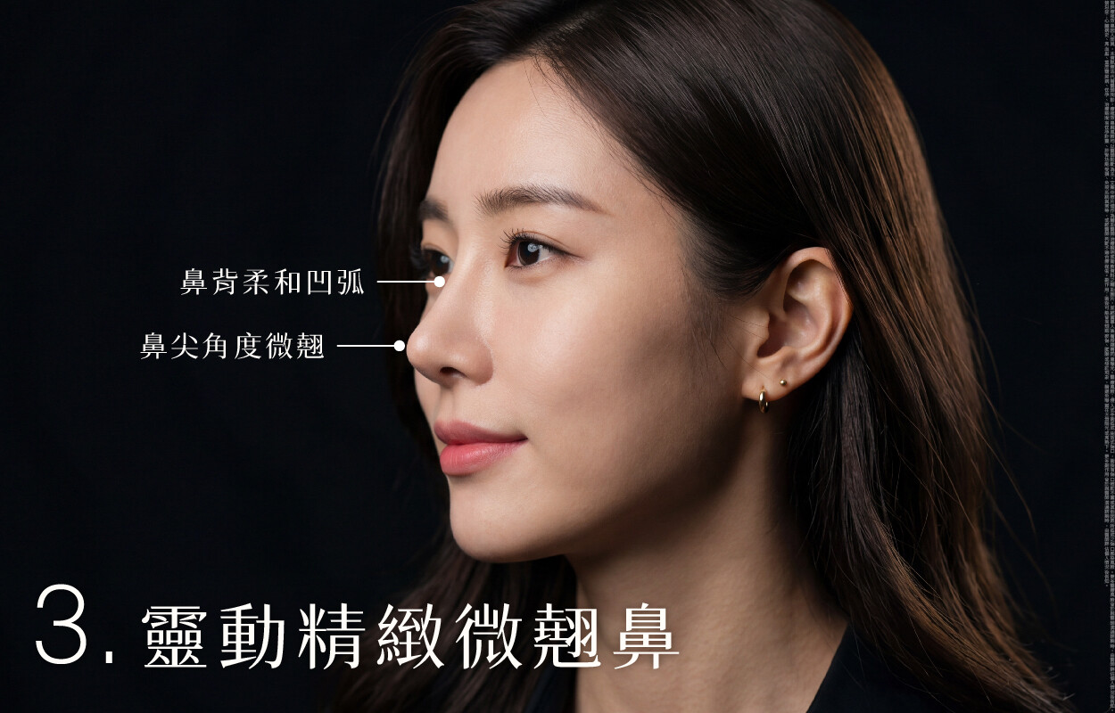 這款鼻型的巧思在於「鼻尖的微翹角度」。鼻背線條可以直挺或帶有極微小的柔和凹弧,但到了鼻尖處,醫師會運用軟骨精雕技術讓鼻尖微微上挺,這種是精緻的微翹,而非露出鼻孔的朝天感。嬌俏、活潑、充滿少女的靈動感。微翹的鼻尖能有效縮短中段臉的視覺長度,達到非常好的減齡與集中五官效果。