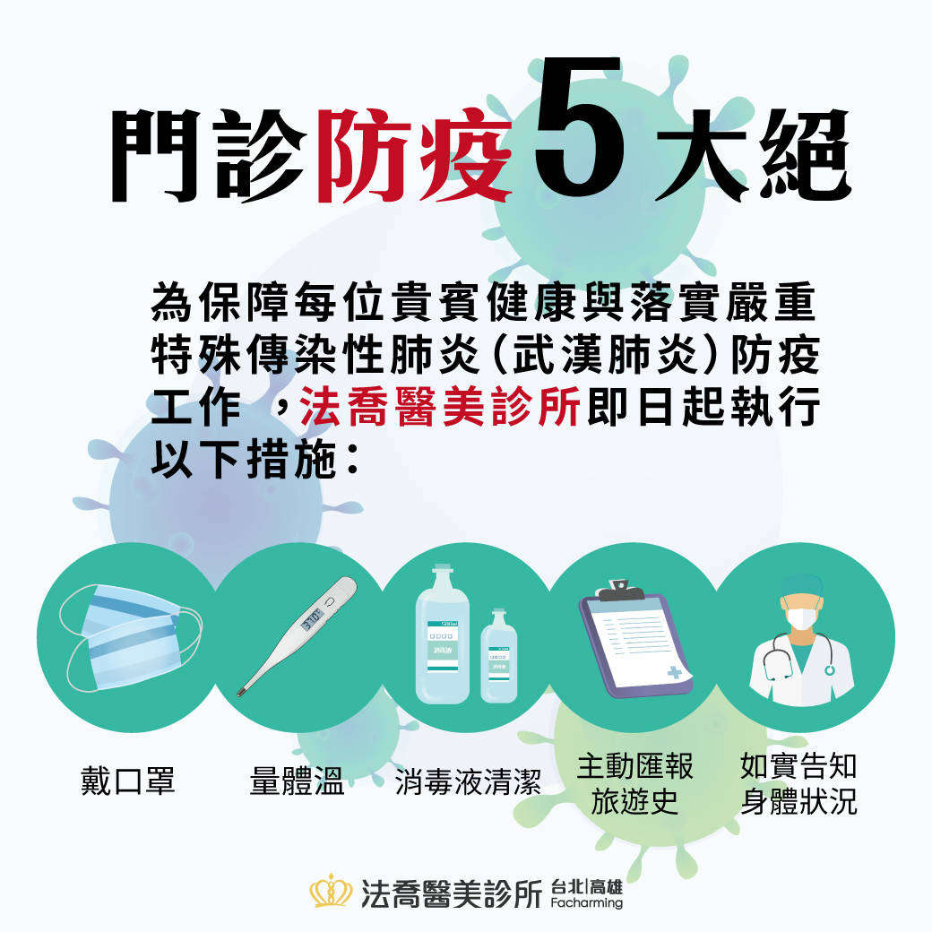 新冠肺炎門診防疫5大絕為保障每位貴賓健康與落實嚴重特殊傳染性肺炎(新冠肺炎)防疫工作,法喬醫美診所即日起執行以下措施: 1.主動量測並記錄來本所貴賓體溫,若體溫超過37.5℃建議先行就醫,排除感染再進行本所醫美療程 2.全體服務同仁全面配戴口罩並著重環境消毒暨手部消毒 3.診所同仁自主量測體 …on- Sat, 01 Feb 2020- READ MORE - -