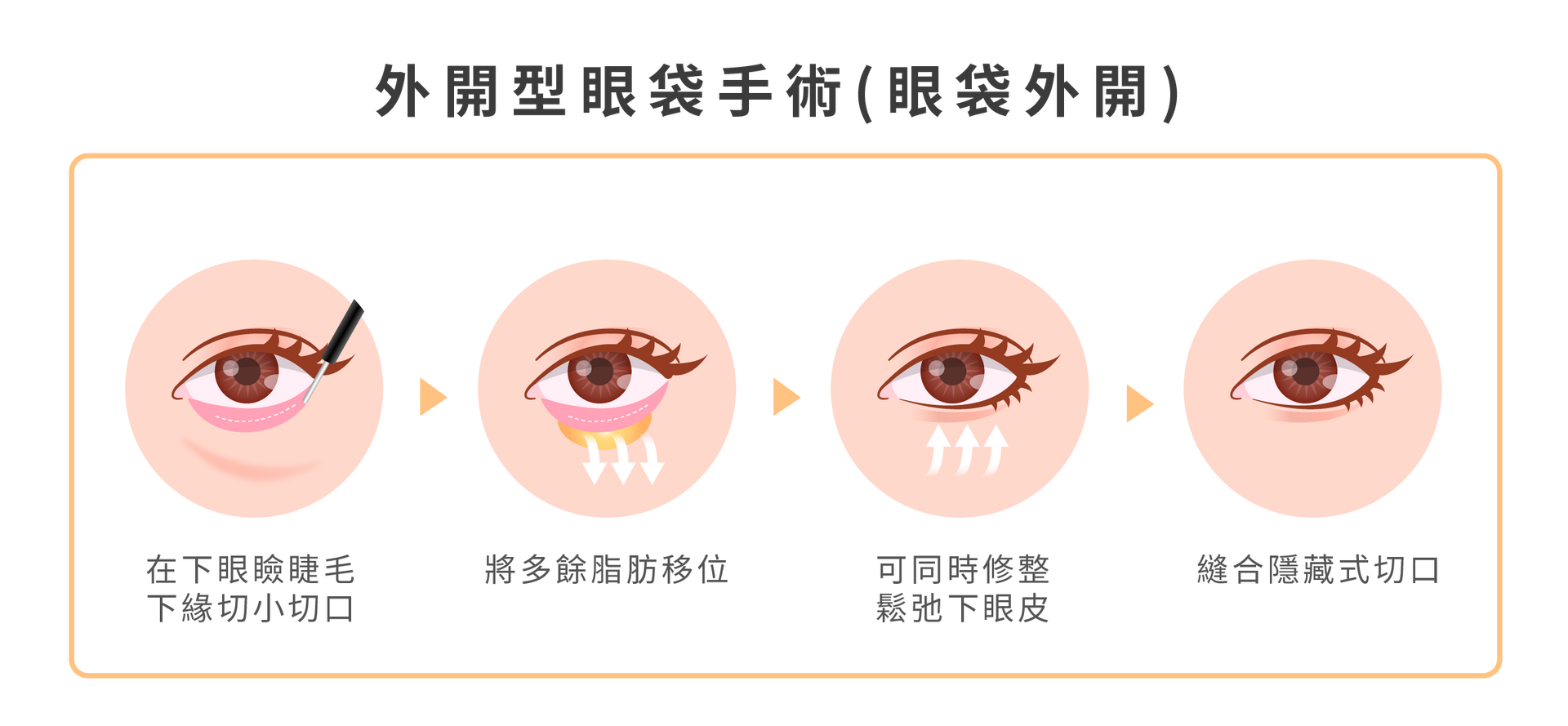 眼袋皮膚鬆弛者,可經由眼袋外開手術,將眼袋脂肪往下移位使淚溝填平,並將鬆弛的下眼皮拉緊,剪除多餘贅皮,讓整個眼睛看起來更炯炯有神,擺脫老態。
