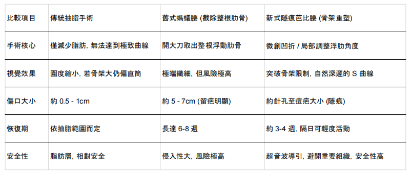 傳統觀念總以為「瘦下來就會有腰」,卻忽略了關鍵的「浮肋骨架角度」。透過表格,帶您了解法喬新式隱痕隱痕芭比腰的優勢: