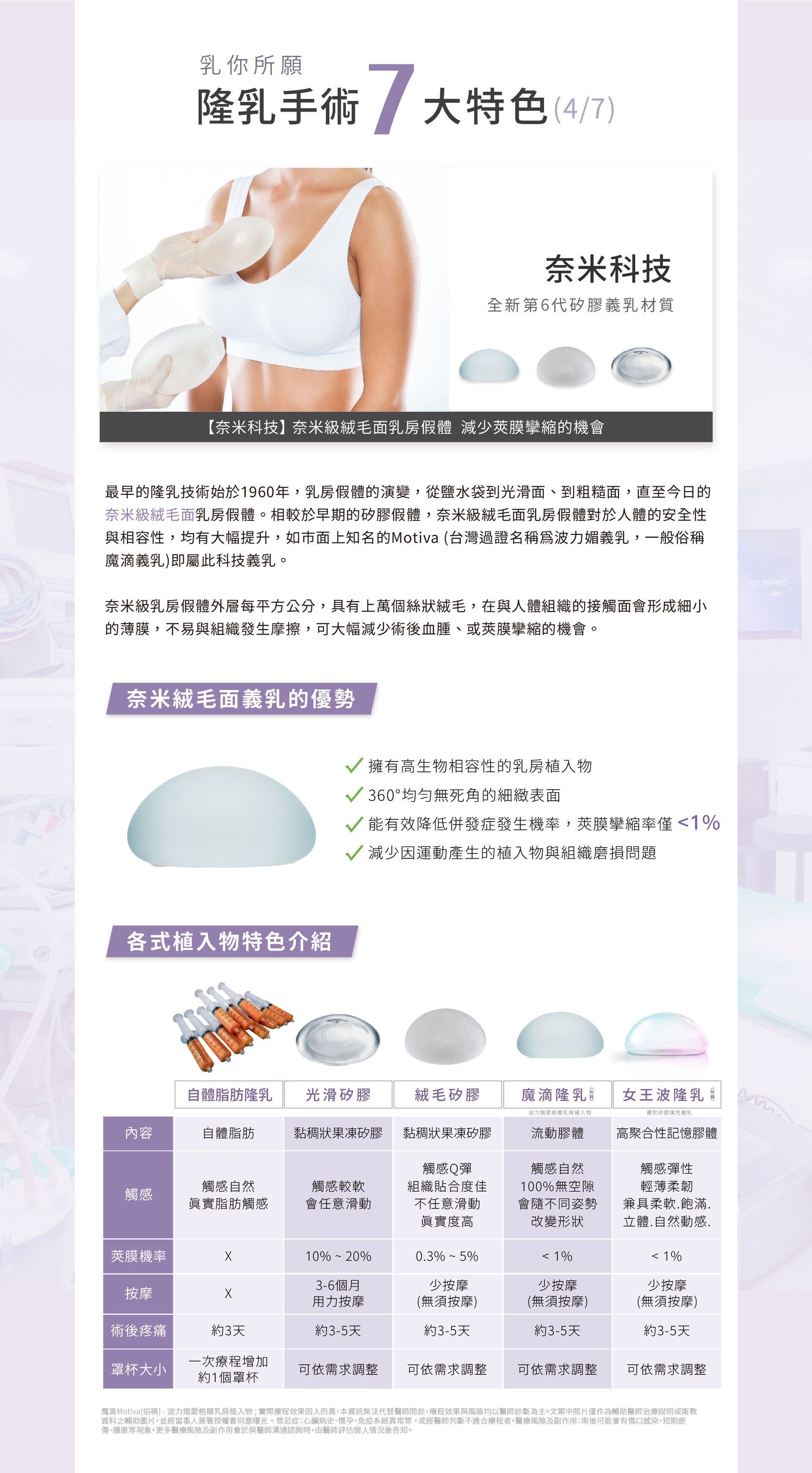 法喬.隆乳手術7大特色(4/7).奈米科技.全新第6代矽膠義乳材質.【奈米科技】 奈米級絨毛面乳房假體 減少莢膜攣縮的機會.最早的隆乳技術始於1960年,乳房假體的演變,從鹽水袋到光滑面、到粗糙面,直至今日的奈米級絨毛面乳房假體。相較於早期的矽膠假體,奈米級絨毛面乳房假體對於人體的安全性與相容性,均有大幅提升,如市面上知名的Motiva (台灣過證名稱為波力媚義乳,一般俗稱魔滴義乳)即屬此科技義乳。奈米級乳房假體外層每平方公分,具有上萬個絲狀絨毛,在與人體組織的接觸面會形成細小的薄膜,不易與組織發生摩擦,可大幅減少術後血腫、或莢膜攣縮的機會。.奈米絨毛面義乳的優勢