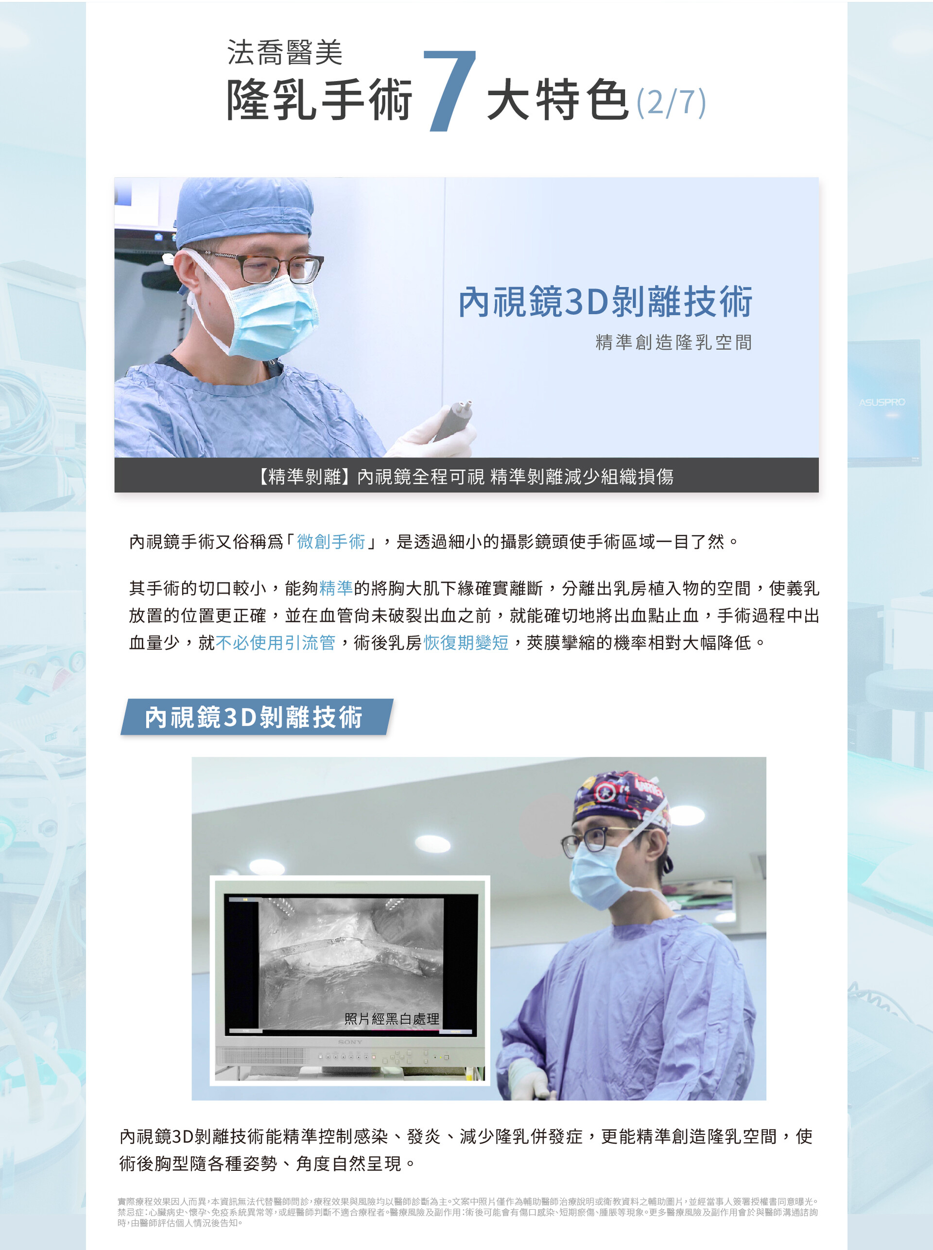 法喬.隆乳手術7大特色(2/7).內視鏡3D剝離技術.精準創造隆乳空間.【精準剝離】 內視鏡全程可視 精準剝離減少組織損傷.內視鏡手術又俗稱為「微創手術」,是透過細小的攝影鏡頭使手術區域一目了然。其手術的切口較小,能夠精準的將胸大肌下緣確實離斷,分離出乳房植入物的空間,使義乳放置的位置更正確,並在血管尚未破裂出血之前,就能確切地將出血點止血,手術過程中出血量少,就不必使用引流管,術後乳房恢復期變短,莢膜攣縮的機率相對大幅降低。.內視鏡3D剝離技術.照片經黑白處理.內視鏡3D剝離技術能精準控制感染、發炎、減少隆乳併發症,更能精準創造隆乳空間,使術後胸型隨各種姿勢、角度自然呈現。.實際療程效果因人而異,本資訊無法代替醫師問診,療程效果與風險均以醫師診斷為主。文案中照片僅作為輔助醫師治療說明或衛教資料之輔助圖片,並經當事人簽署授權書同意曝光。禁忌症:心臟病史、懷孕、免疫系統異常等,或經醫師判斷不適合療程者。醫療風險及副作用:術後可能會有傷口感染、短期瘀傷、腫脹等現象。更多醫療風險及副作用會於與醫師溝通諮詢時,由醫師評估個人情況後告知。