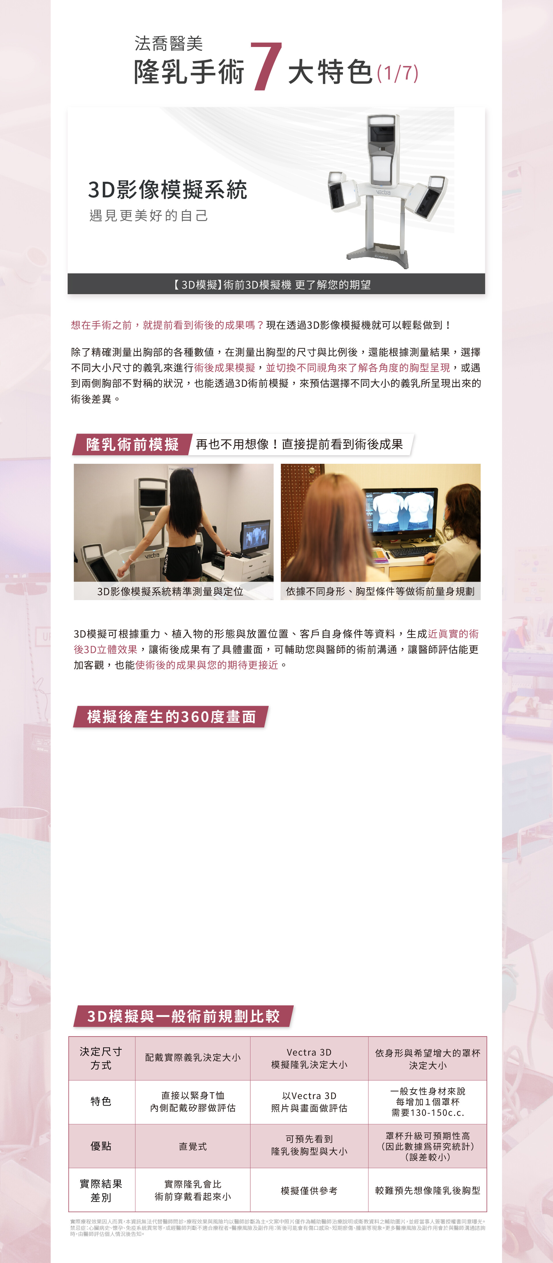 法喬.隆乳手術7大特色(1/7).3D影像模擬系統.遇見更美好的自己.【 3D模擬】術前3D模擬機 更了解您的期望.想在手術之前,就提前看到術後的成果嗎?現在透過3D影像模擬機就可以輕鬆做到!除了精確測量出胸部的各種數值,在測量出胸型的尺寸與比例後,還能根據測量結果,選擇不同大小尺寸的義乳來進行術後成果模擬,並切換不同視角來了解各角度的胸型呈現,或遇到兩側胸部不對稱的狀況,也能透過3D術前模擬,來預估選擇不同大小的義乳所呈現出來的術後差異。