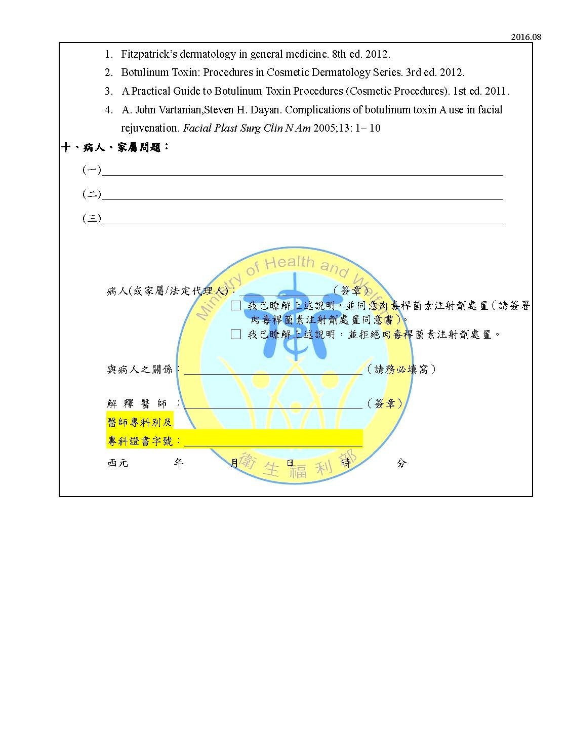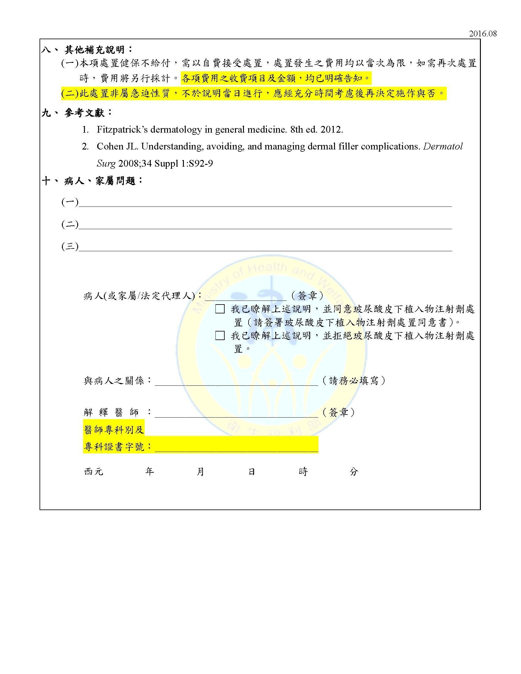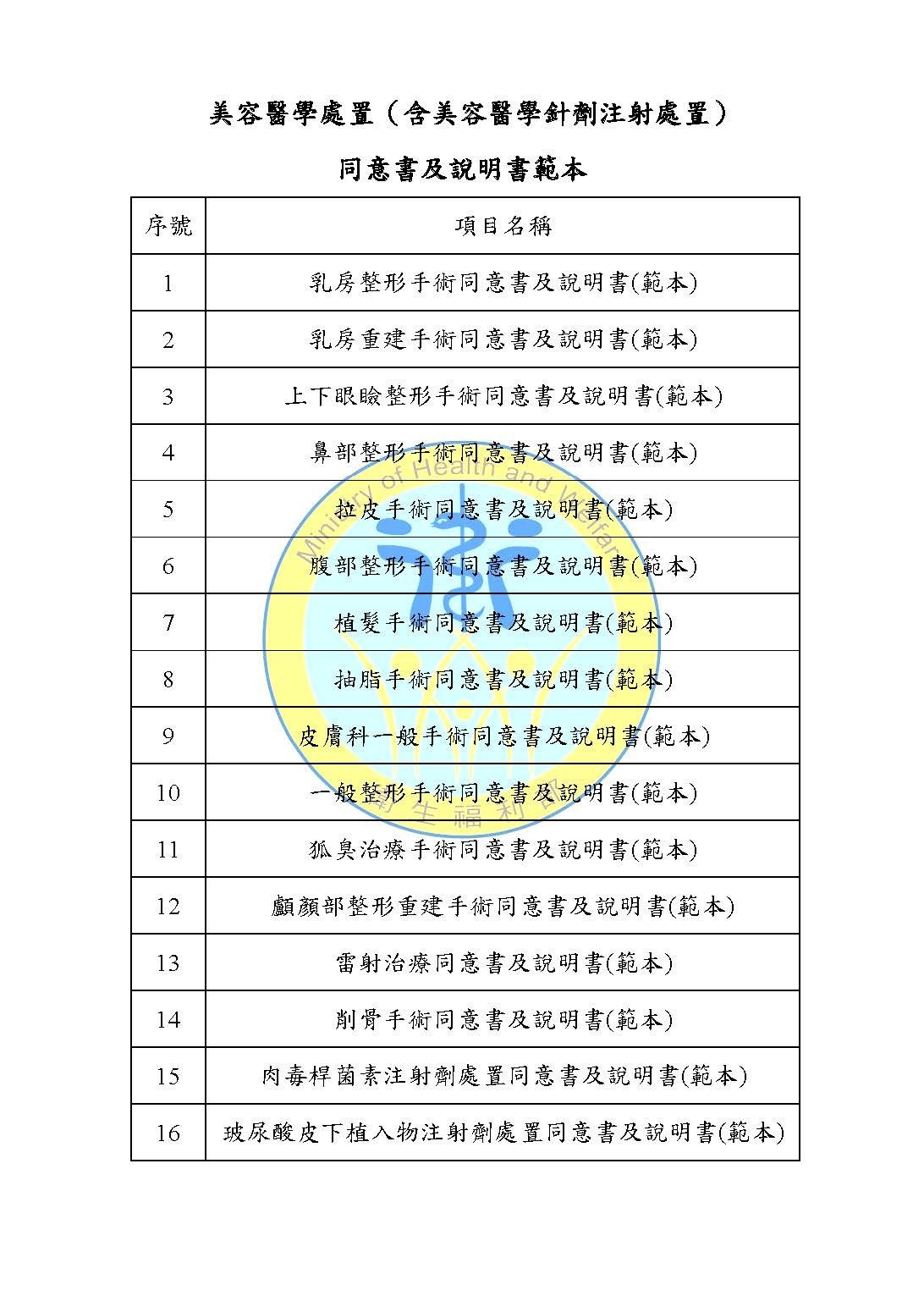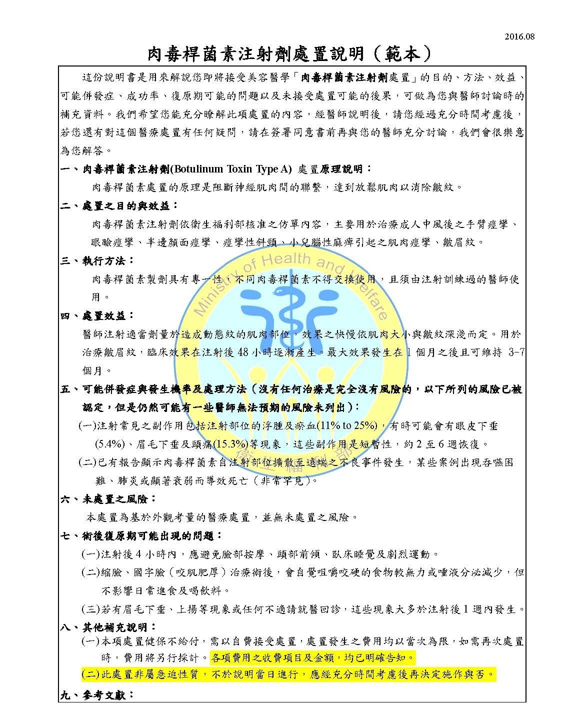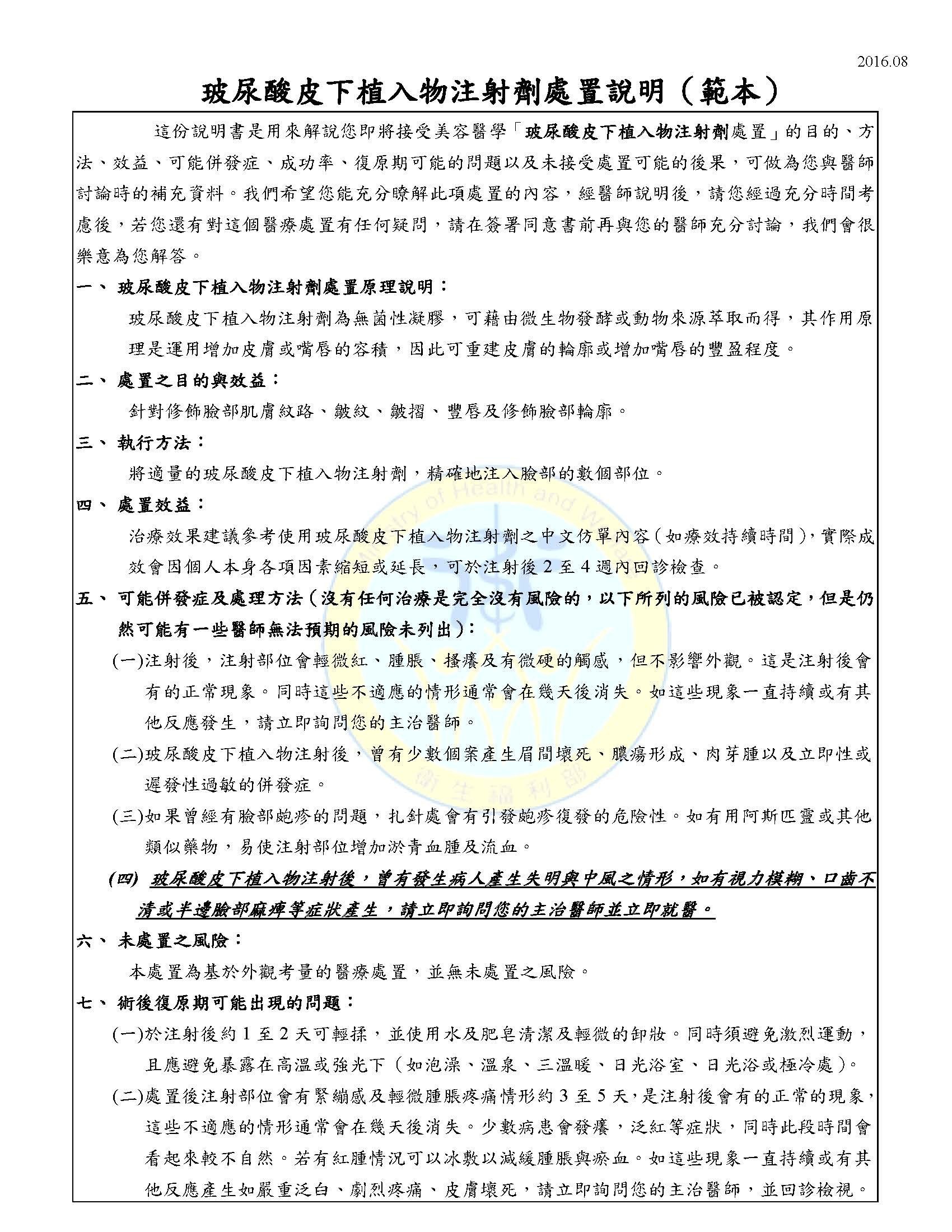 行政院衛生福利部2013/01/04公告:「『美容醫學』一般係指由專業醫師透過醫學技術,如:手術,藥物,醫療器械,生物科技材料等,執行具侵入性或低侵入性醫療本 網站之相關案例照片皆經簽署肖像權並同意發表,效果因人而異。根據衛部醫字第1031660048號,衛署醫字0990262180號,衛部醫字第1031662939號處理,宣傳名稱與仿單不盡相同(標籤外使用);任何療程介紹均以醫師“足以說明”為準,請特別留意。