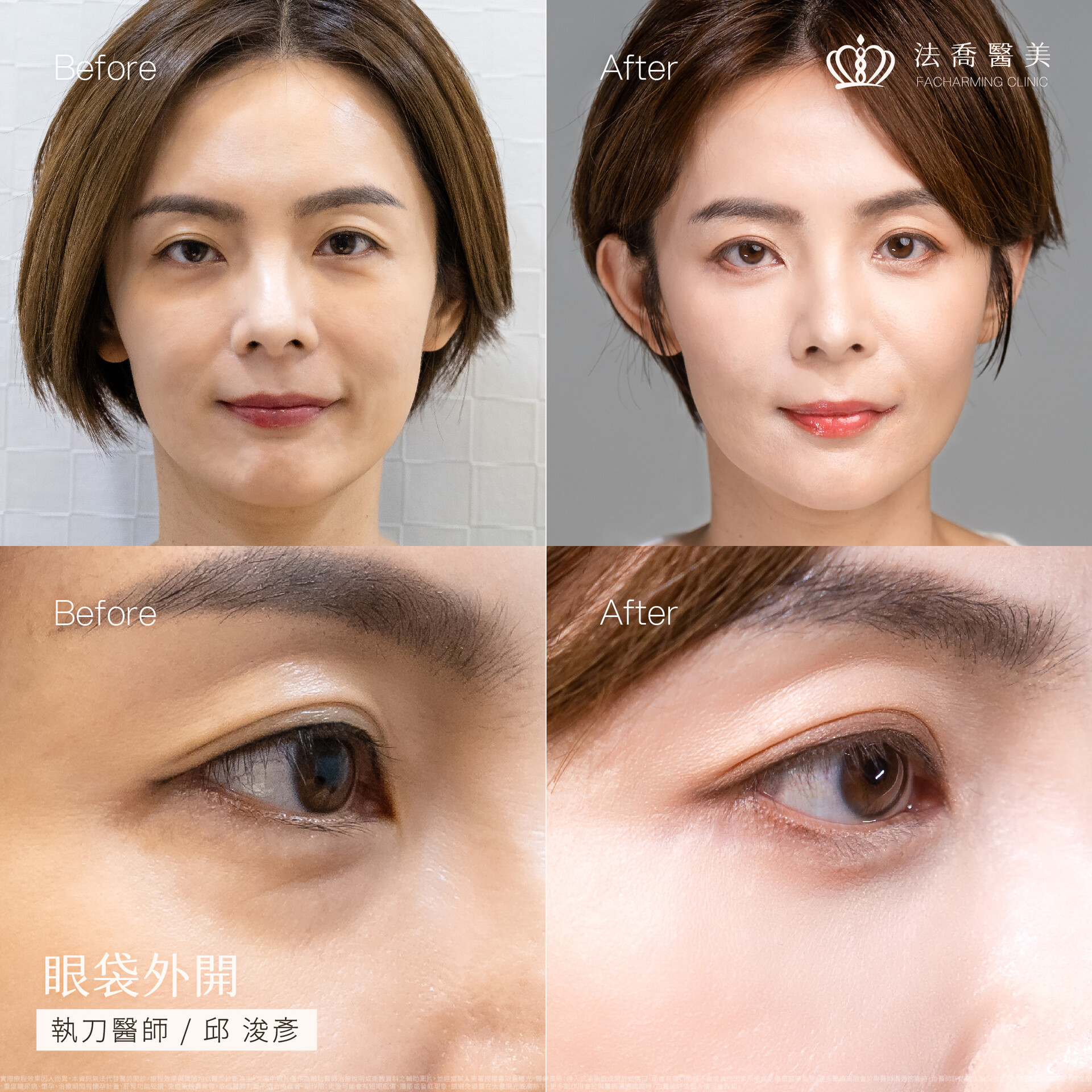 A:法喬採用隱痕微創技術,切眉手術的切口會隱藏在眉毛下緣,眼袋手術若採用內開則外觀無疤;外開則隱藏於下睫毛根部。復原後隨著時間淡化,肉眼幾乎難以察覺。