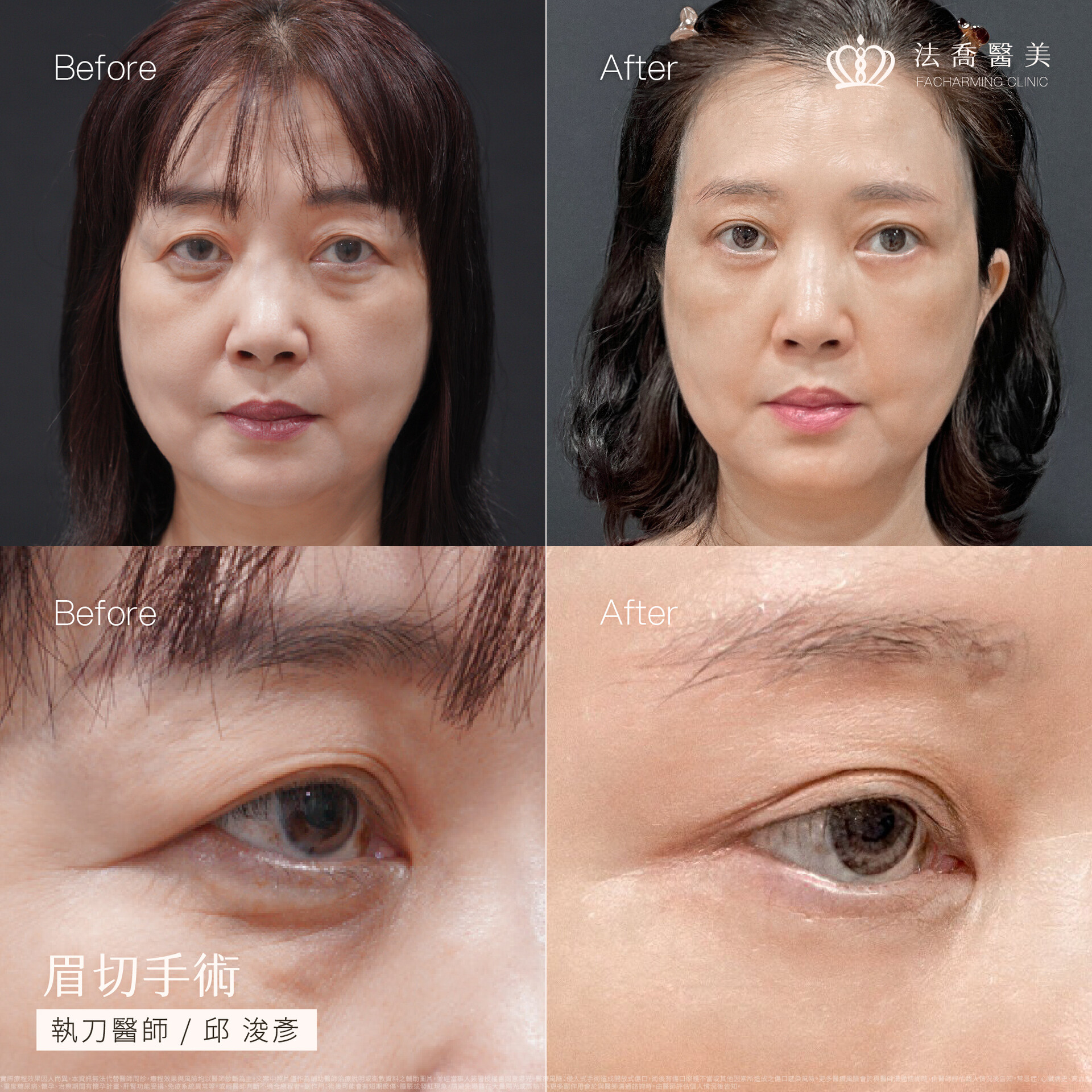 ●手術特點:沿著眉毛邊緣設計隱痕切口,將鬆弛的皮膚向上拉提,把傷口藏於眉毛下方,復原後幾乎無顯著疤痕。不僅能找回原本不遮擋視線的輕盈眼皮,更能讓眼神瞬間「亮」起來,恢復年輕時的神采飛揚。